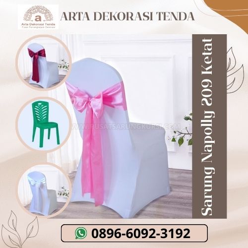 Sarung kursi Napolly 209 model ketat, pas di badan kursi, tampil rapi dan elegan untuk pesta, hajatan, atau acara formal. Bahan lentur dan nyaman.