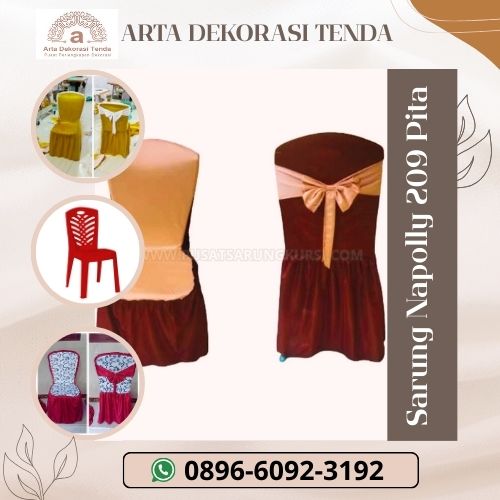 Sarung kursi Napolly 209 dengan aksen pita, tampil rapi dan elegan, sempurna untuk pesta, pernikahan, dan acara formal. Bahan lentur dan nyaman.