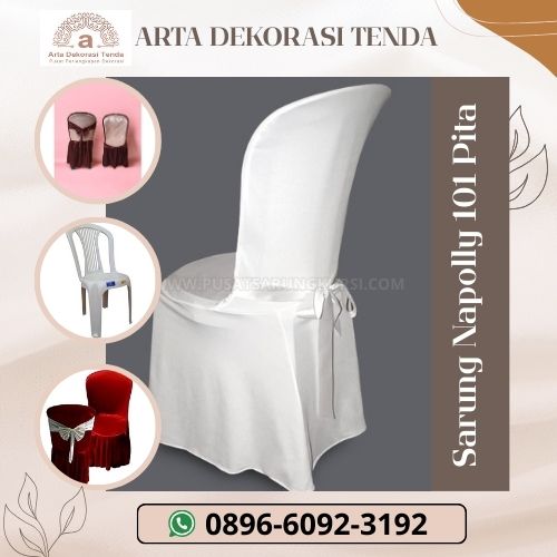 Sarung kursi Napolly 101 dengan aksen pita, rapi dan elegan, ideal untuk dekorasi pesta, pernikahan, dan acara formal. Bahan lentur dan nyaman digunakan.